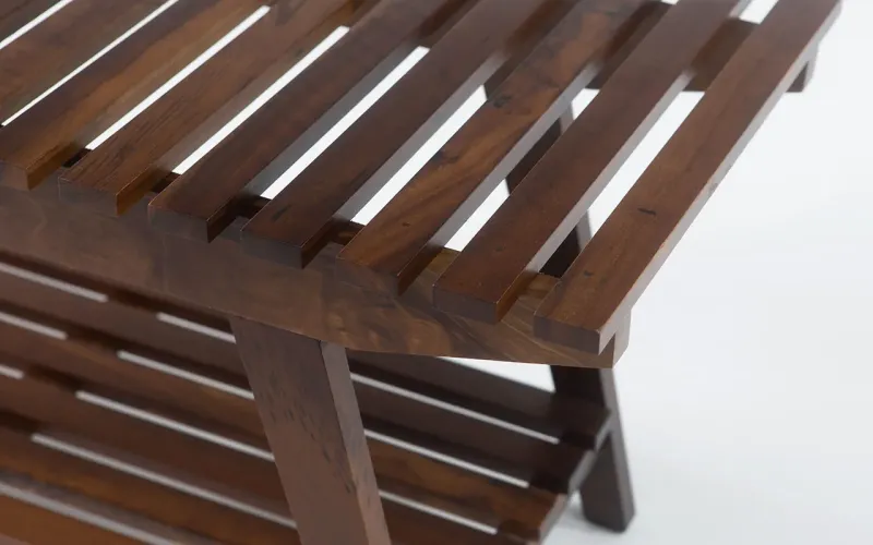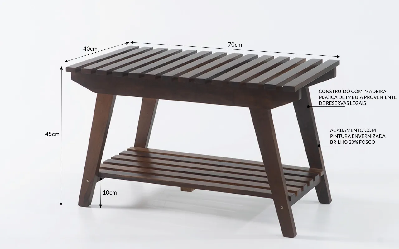 O banco decorativo de madeiraiah é uma releitura dessas peças e é construída com madeira maciça de imbuia natural, proveniente de sobras de estoques legais da madeira, utilizada há décadas e mantidas por algumas peças de móveis de Santa Catarina.